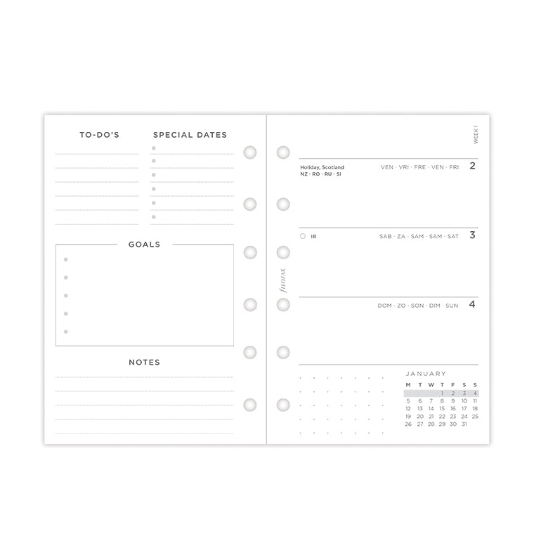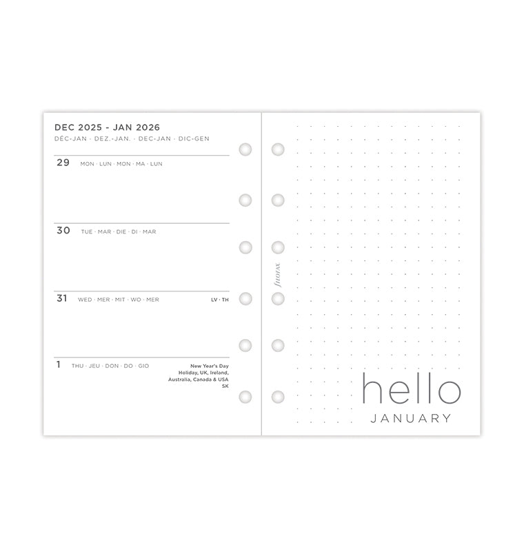 Aggiungi un tocco personale ai tuoi piani con il refill datato Minimal. Questo diario contemporaneo formato Pocket è caratterizzato da layout settimanale orizzontale e pagine di un bianco vivido e pulito, che potrete organizzare con la massima libertà. Dotato di pagina "Belongs to" personalizzabile. Calendari dell'anno corrente e di quello seguente, per i progetti futuri. Le pagine "lavagna" inaugurano l'inizio di ogni mese. La sezione "Big Plans" composta da pagine dotted è ideale per ospitare un elenco degli obiettivi mensili. Alla fine del diario troverete anche pagine a righe e dotted, ideali per i tuoi schizzi e appunti. Multilingue. In carta adatta alla scrittura con penna stilografica.